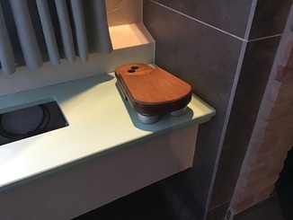 Tevens een akoestisch gedempt aan-de-muur-hangend meubel gemaakt met DIY berkenmultiplex speakerstands op Isonoe Feets en Vibrapods waar de Devialet's hun plaats hebben. Op die manier zitten ook alle kabels ed netjes verborgen in het meubel.